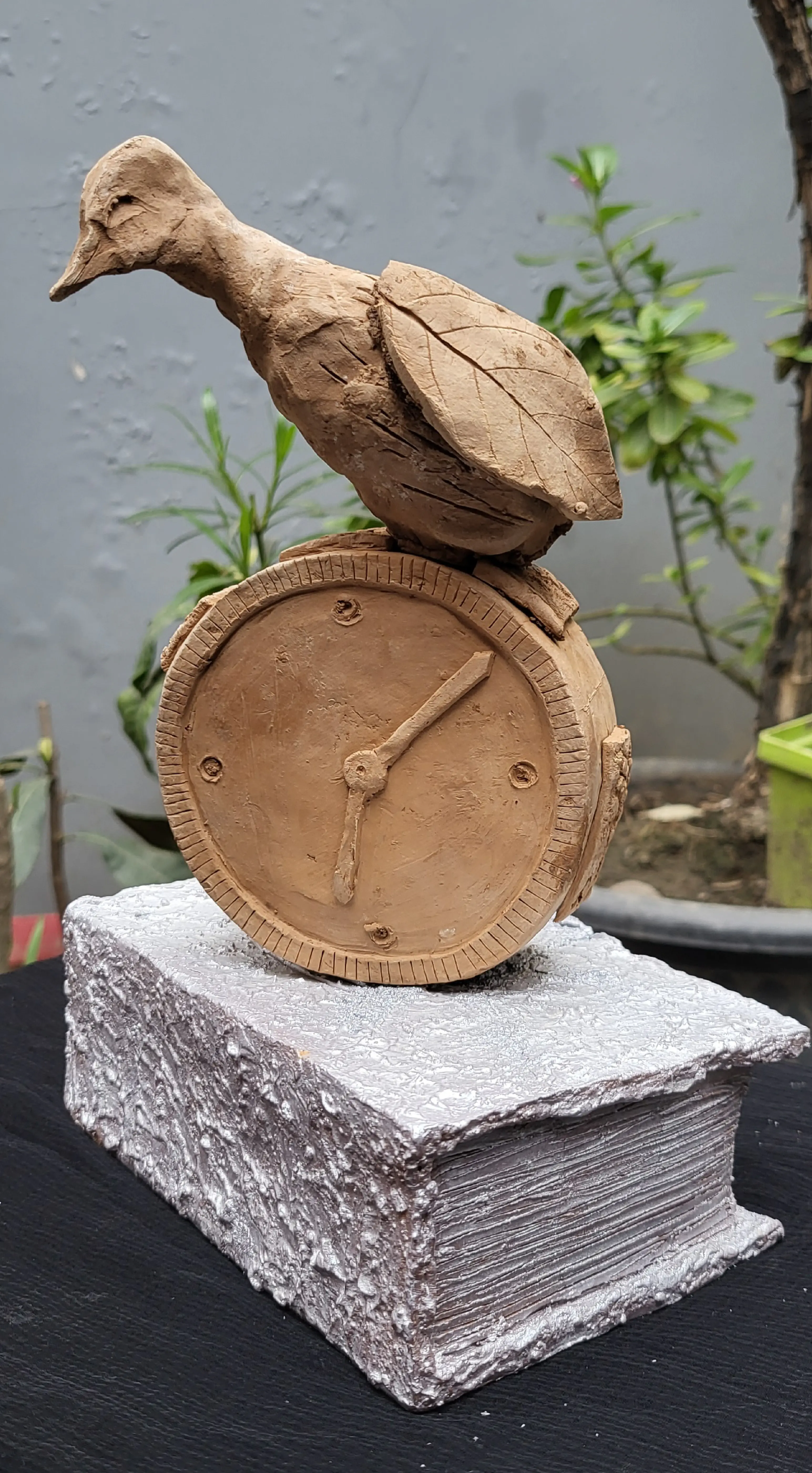 This ceramic artwork has a book at the bottom, a clock in the middle, and a bird on top. The book represents knowledge, the clock symbolizes time, and the bird adds a lively touch. Together, creating a meaningful and visually appealing composition.